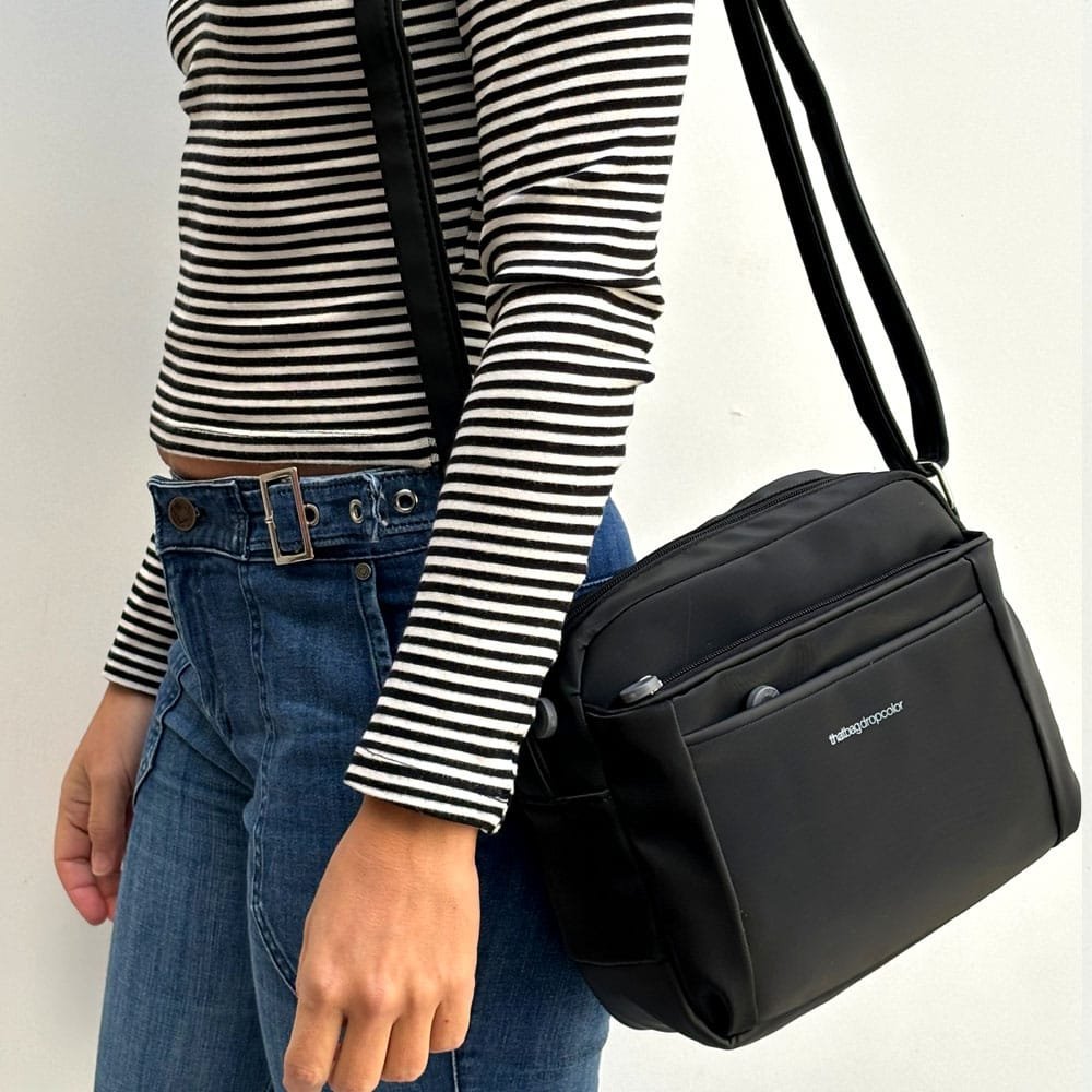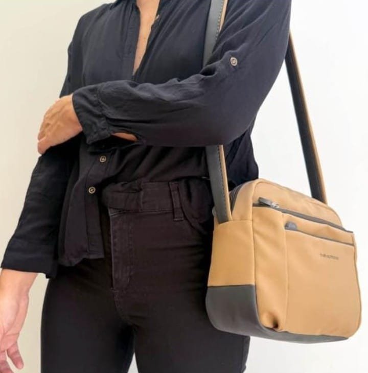 Bandolera Punch, con correa regulable, bolsillo externo compartimentado, bolsillo frontal y en su interior: Porta celular.
