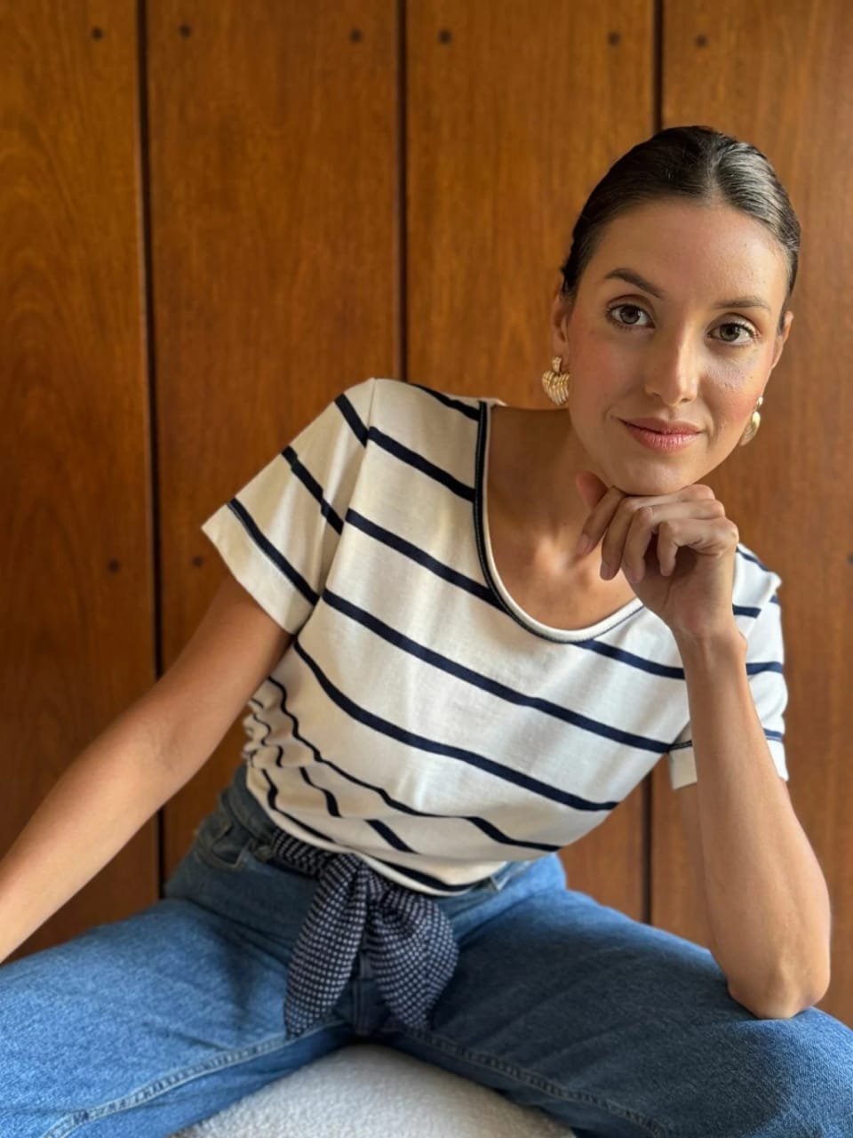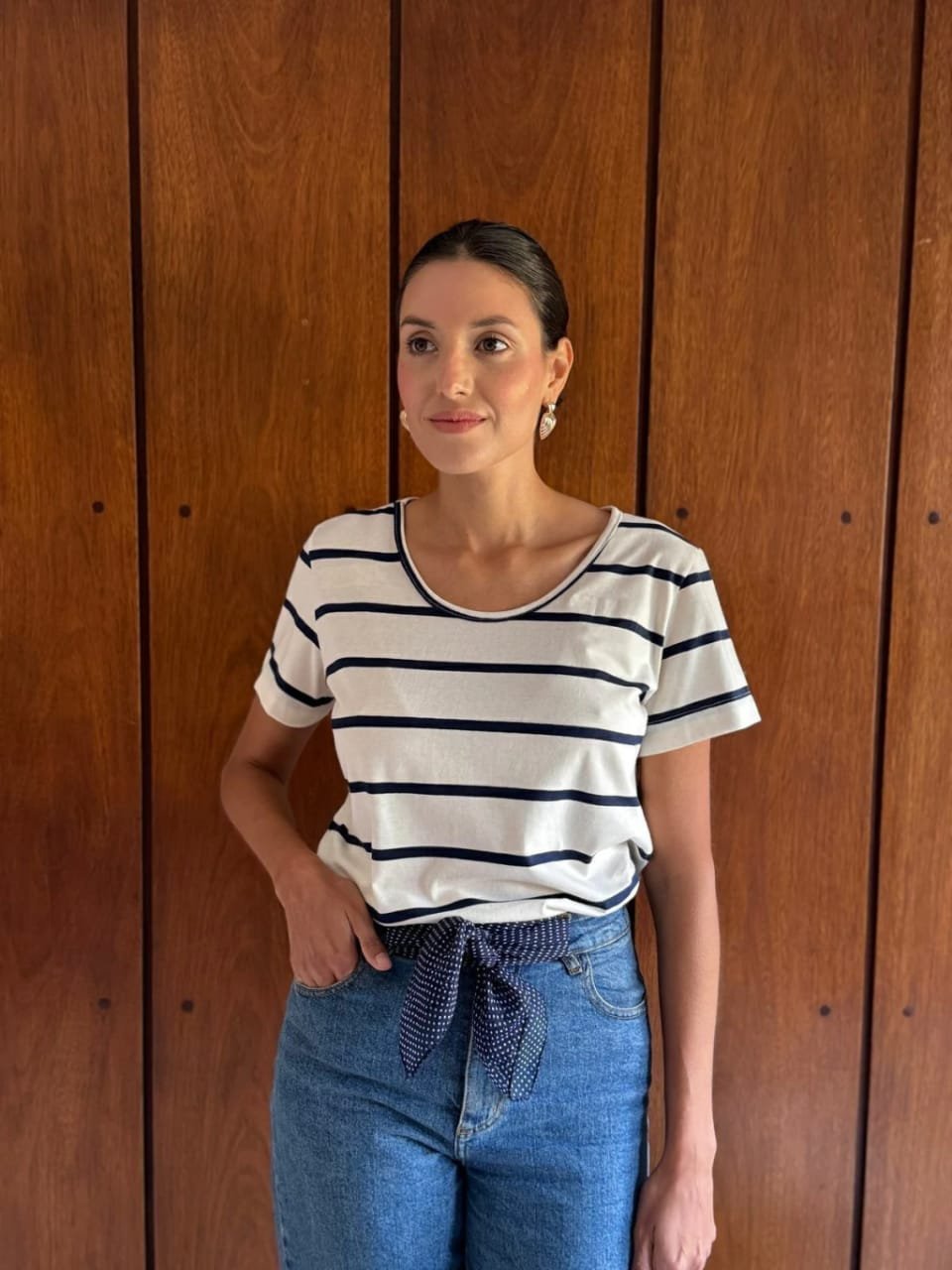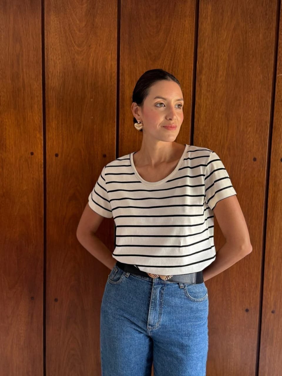 Remera manga corta, cuello redondo, corte recto. Material: jersey peinado 100% algodón rayado.