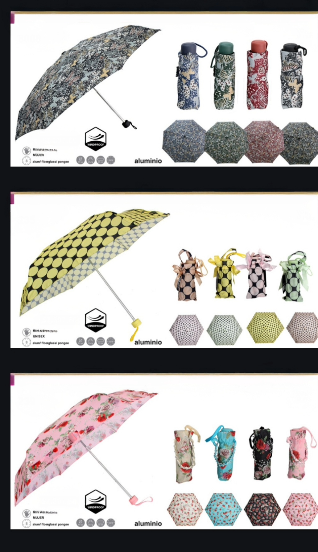 Ideales para llevar en la cartera o mochila, estos paraguas combinan practicidad con un diseño moderno. Su estructura de aluminio y fibra de vidrio brinda resistencia sin sumar peso, y la tela pongee impermeable garantiza una excelente protección contra la lluvia.